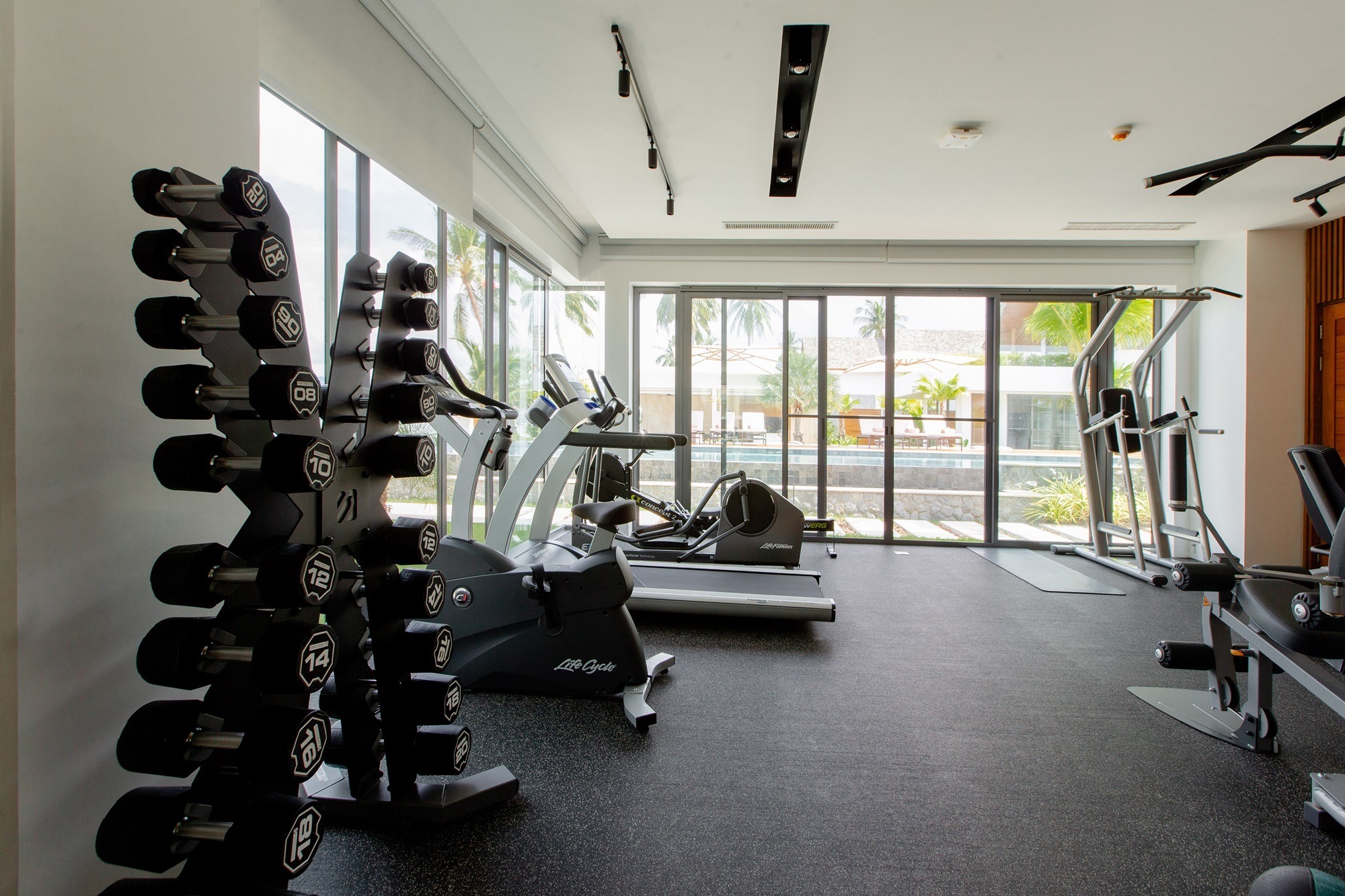 Elevate Your Workout with an Unrivaled Sea View At Masima Samui, fitness meets serenity. Our private gym is designed to keep you inspired, featuring floor-to-ceiling windows that overlook the sparkling pool and the azure horizon of Koh Samui. Whether you’re starting your day with a morning run or ending it with a sunset session, our gym provides the perfect backdrop for your wellness journey in total privacy.